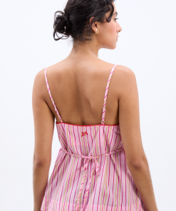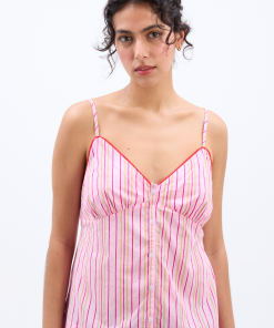 A dreamy staple that works from night to day, the Cosima Strappy Cami in pink stripe is crafted from breathable 100% organic cotton. Designed with adjustable straps, a button-down front, and a delicate contrast red trim, it’s finished with a tie waist for an adjustable fit. Pair with the matching Cosima Frilly Shorts to complete the look.