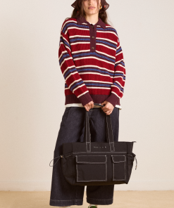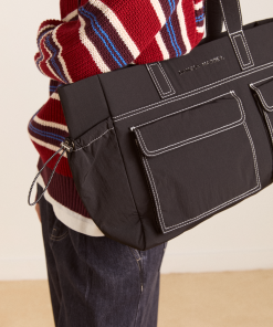 An elevated take on our signature DM tote bags, meet the Eliza Techy Tote Bag in black. This tote keeps all of your essentials secure and organised with its external front pockets and side toggle pockets, as well as an internal pocket and metal zipper closure to keep your valuables safe. Finished with white contrast stitching and rubberised Damson Madder branding, it is the ultimate everyday bag.