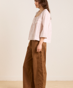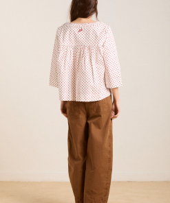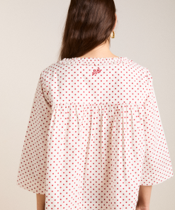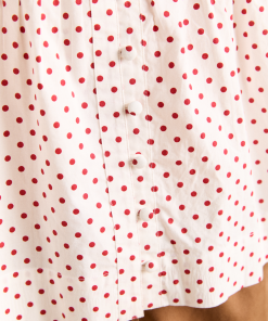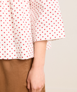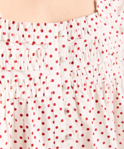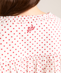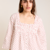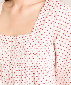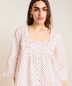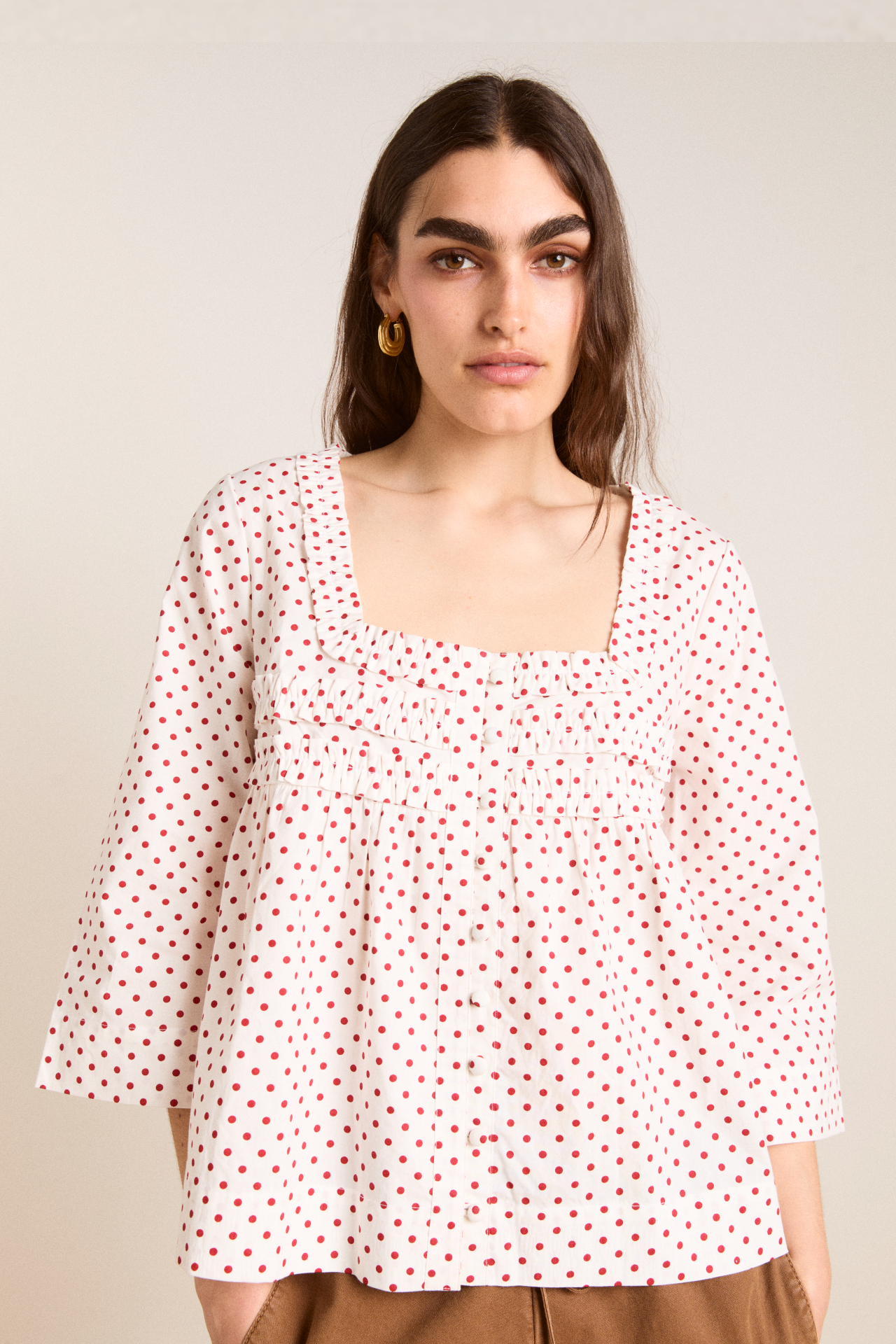 Elevate your look with the Leilani Blouse in off white and red spot. Crafted from 100% organic cotton, this blouse features a square neckline, detailed with ruffles, for a vintage-inspired, feminine feel. Complete with an A-line silhouette and flowy 3/4 sleeves, this blouse is effortless and perfect for any occasion. Pair with our matching Layla Skirt for a head to toe look.