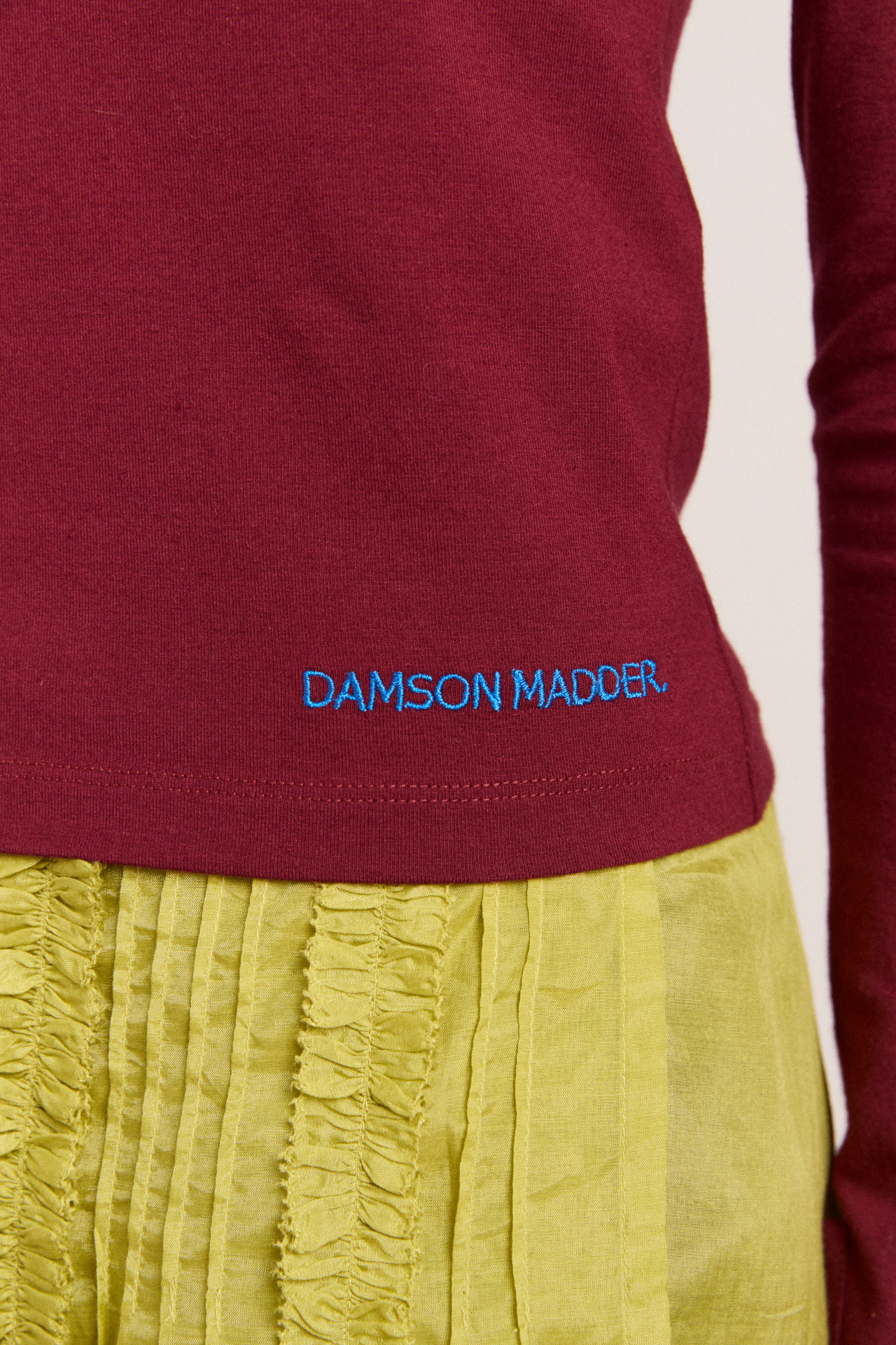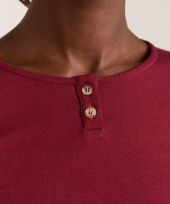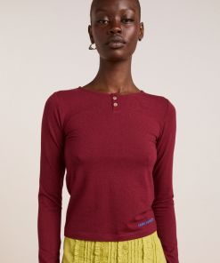Meet your new everyday staple, the Ninette long sleeve top in burgundy. Featuring thumbhole details, a button front neck and contract Damson Madder embroidery on the front, it’s the perfect piece for layering or casual styling.