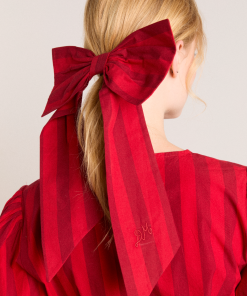 Add the sweetest touch to any outfit with our oversized, 100% organic cotton oversized hair bow clip in red burg stripe. Adorned with an embroidered DM logo and finished with a metal clip closure. Pair with our matching Charlize Blouse and Raphaela Mini Dress.