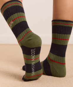 Meet our rib calf length socks in olive multi stripe. Crafted from 75% organic cotton, 23% recycled nylon, and 2% elastane, offering a perfect blend of comfort, durability, and a touch of stretch. The soft, organic cotton ensures a gentle feel against the skin, while the nylon and elastane contribute to enhanced flexibility and shape retention.