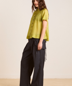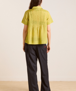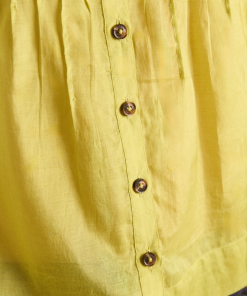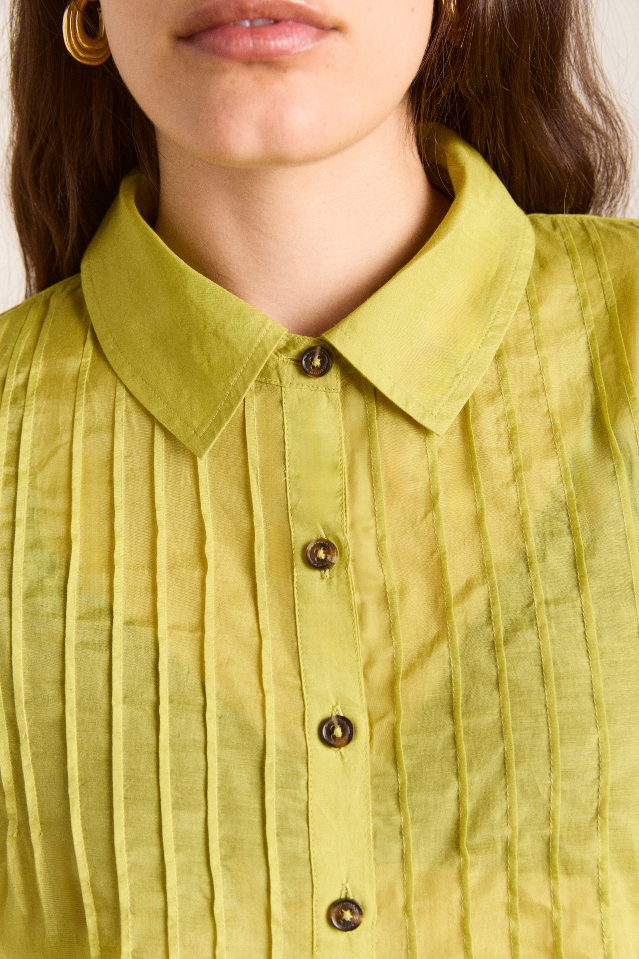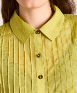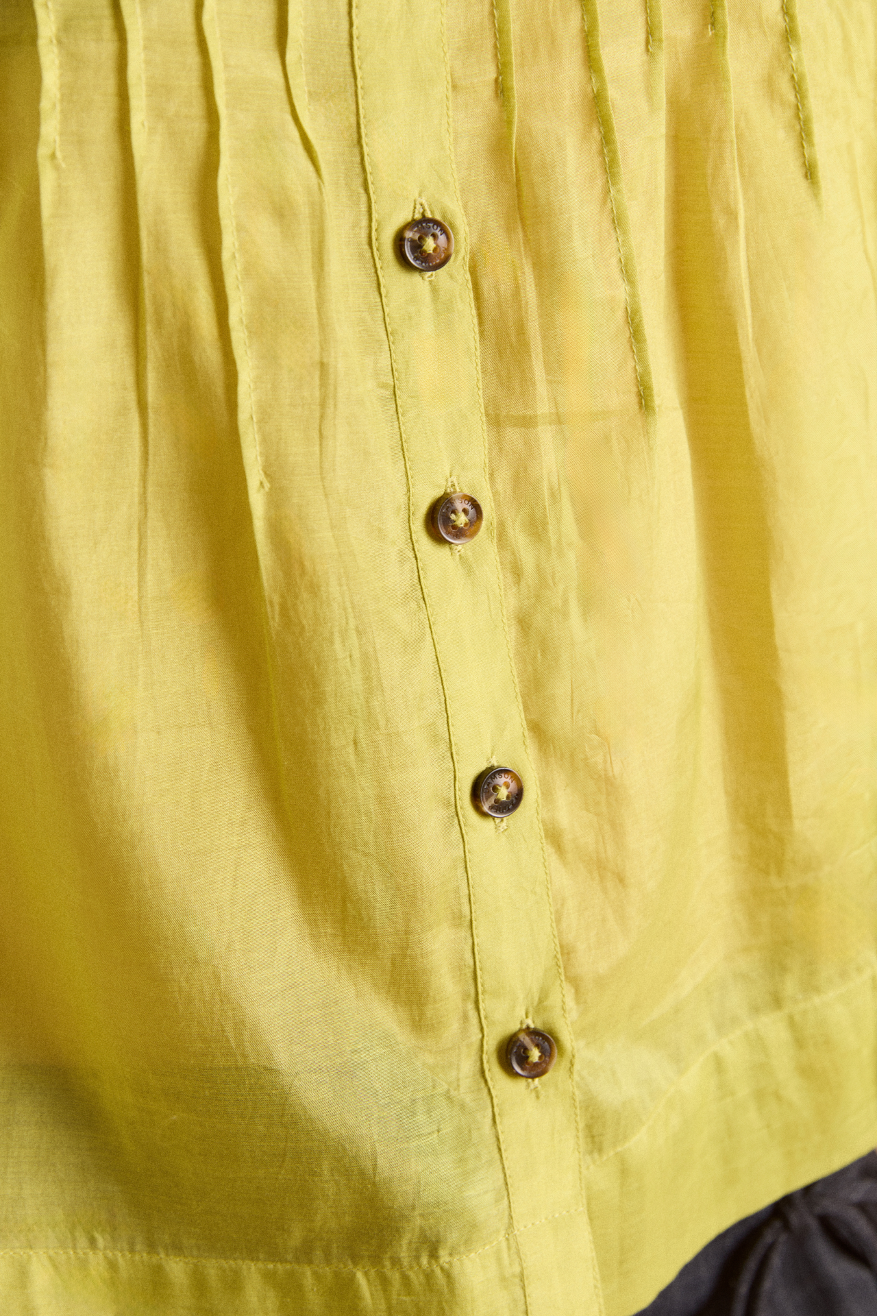 The perfect mix of tailored and floaty, meet the Sheer Wendy Blouse in golden lime. Complete with a sheer finish, button down front, and pin tuck detailing. Pair with our matching Glinda Ruffle Mini Skirt in golden lime for a statement, or with a basic to let the Wendy do all of the talking!