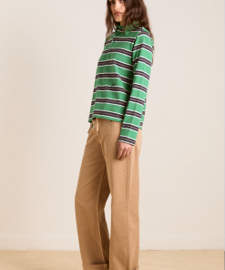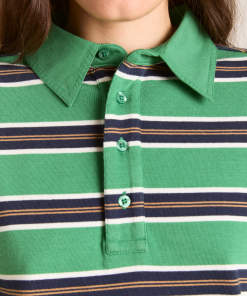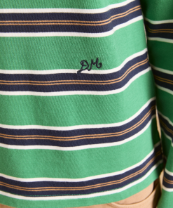 Our best-selling rugby has been reimagined in a new shrunken fit. The Cassia Shrunken Rugby in green stripe fuses traditional sporty style with a modern silhouette. Made from 100% organic cotton, it features a button placket and woven collar. Finished with our signature DM embroidery detailing on the front.