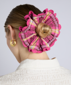 Add a playful pop to your outfit with our Pink Check Scrunchie. This scrunchie is crafted with 100% organic cotton, and finished with a rik rak trim edge detail. Pair with our matching Wavy Bow Tote Bag or Becca Multi Way Midi Dress.