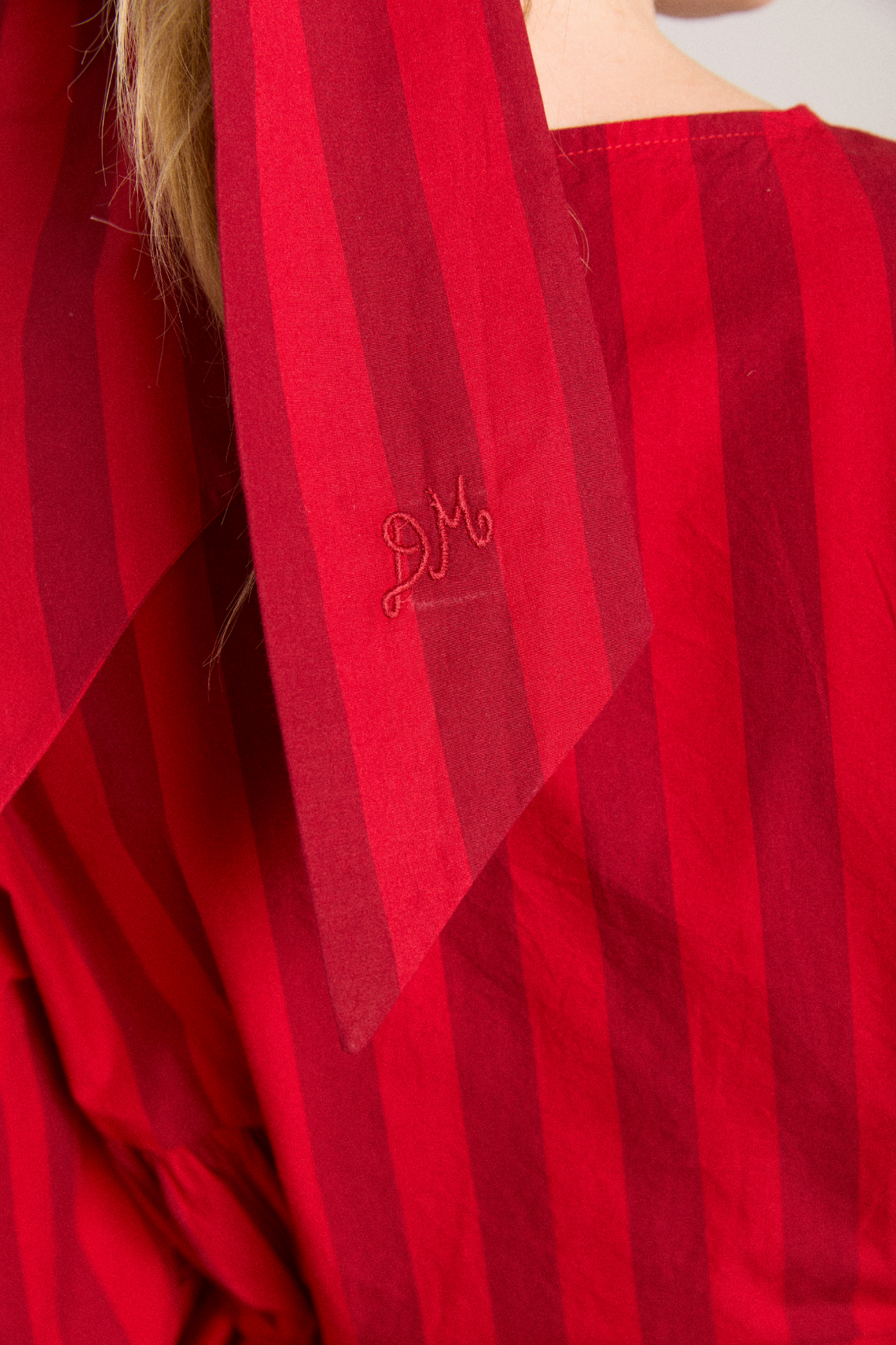 Add the sweetest touch to any outfit with our oversized, 100% organic cotton oversized hair bow clip in red burg stripe. Adorned with an embroidered DM logo and finished with a metal clip closure. Pair with our matching Charlize Blouse and Raphaela Mini Dress.