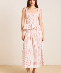 The Raphi Cami in off white and red spot is a sleeveless, square neck top with a shirred bodice and peplum hem. Finished with ruffle detailing for a feminine, vintage touch. Made from 100% organic cotton, it pairs perfectly with the Layla Skirt in off white and red spot.