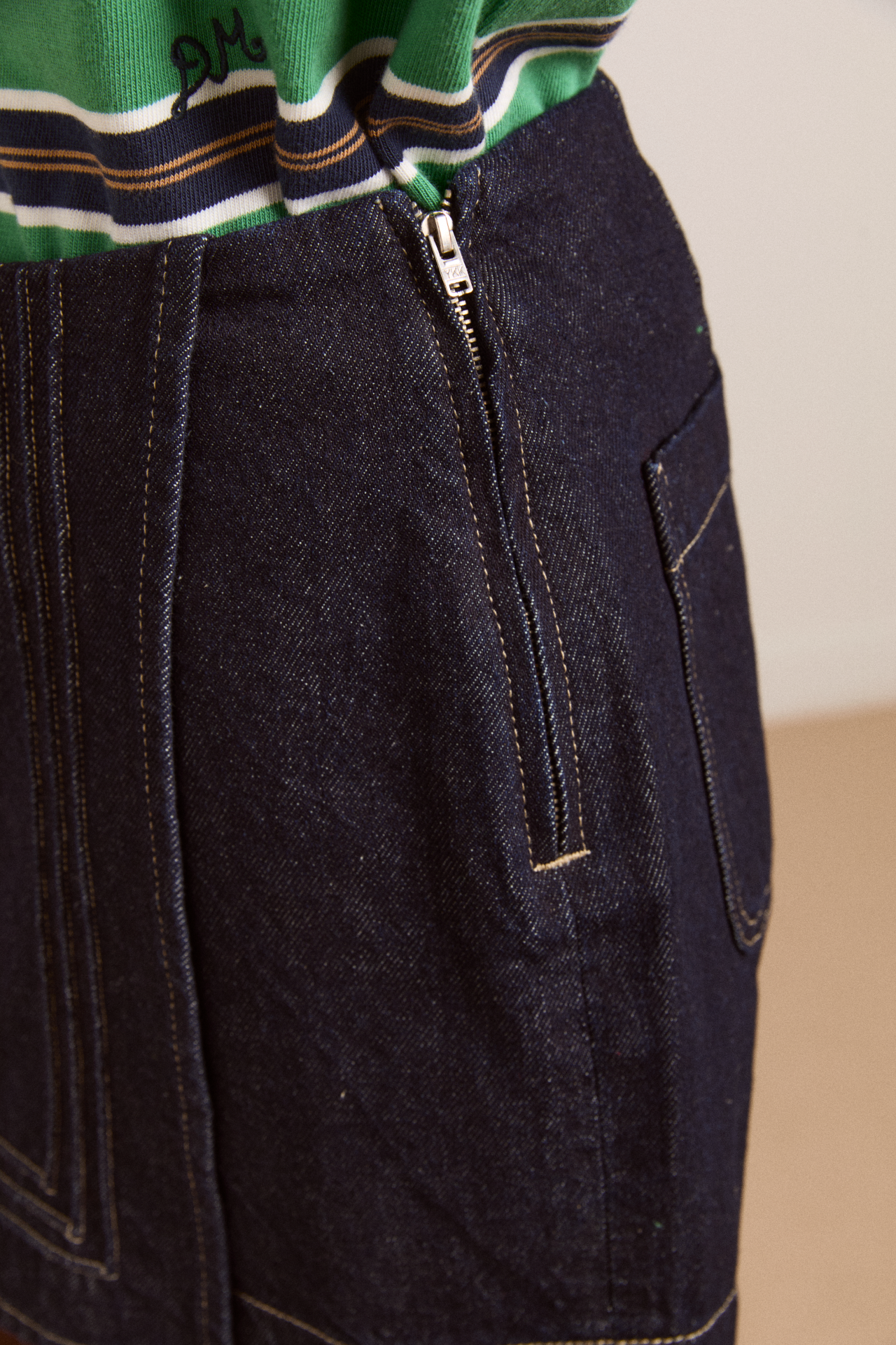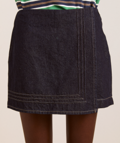 A fresh take on a classic style, the Rory Skirt in indigo denim offers a front wrap fit with pin tuck detailing. Crafted with a blend of organic and recycled cotton, this timeless piece features practical front and back pockets, as well as a signature woven DM patch on the back pocket.
