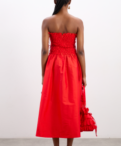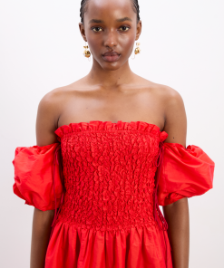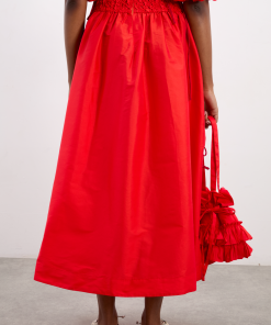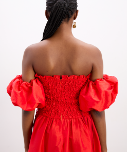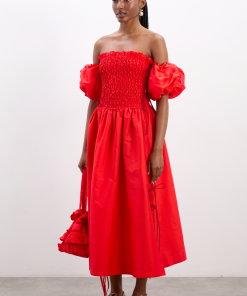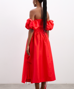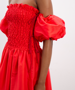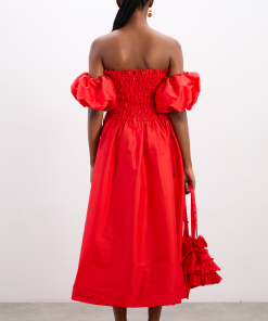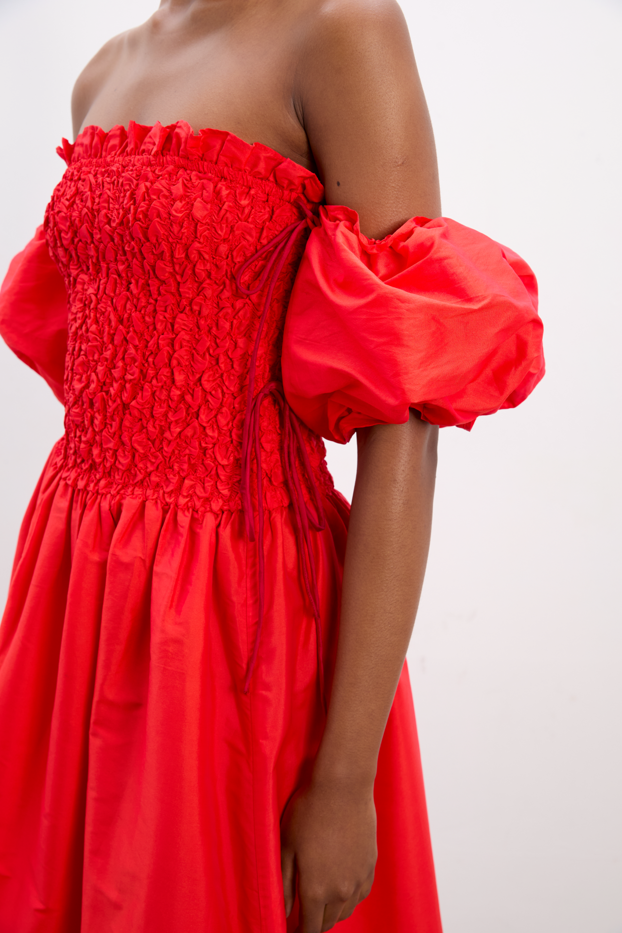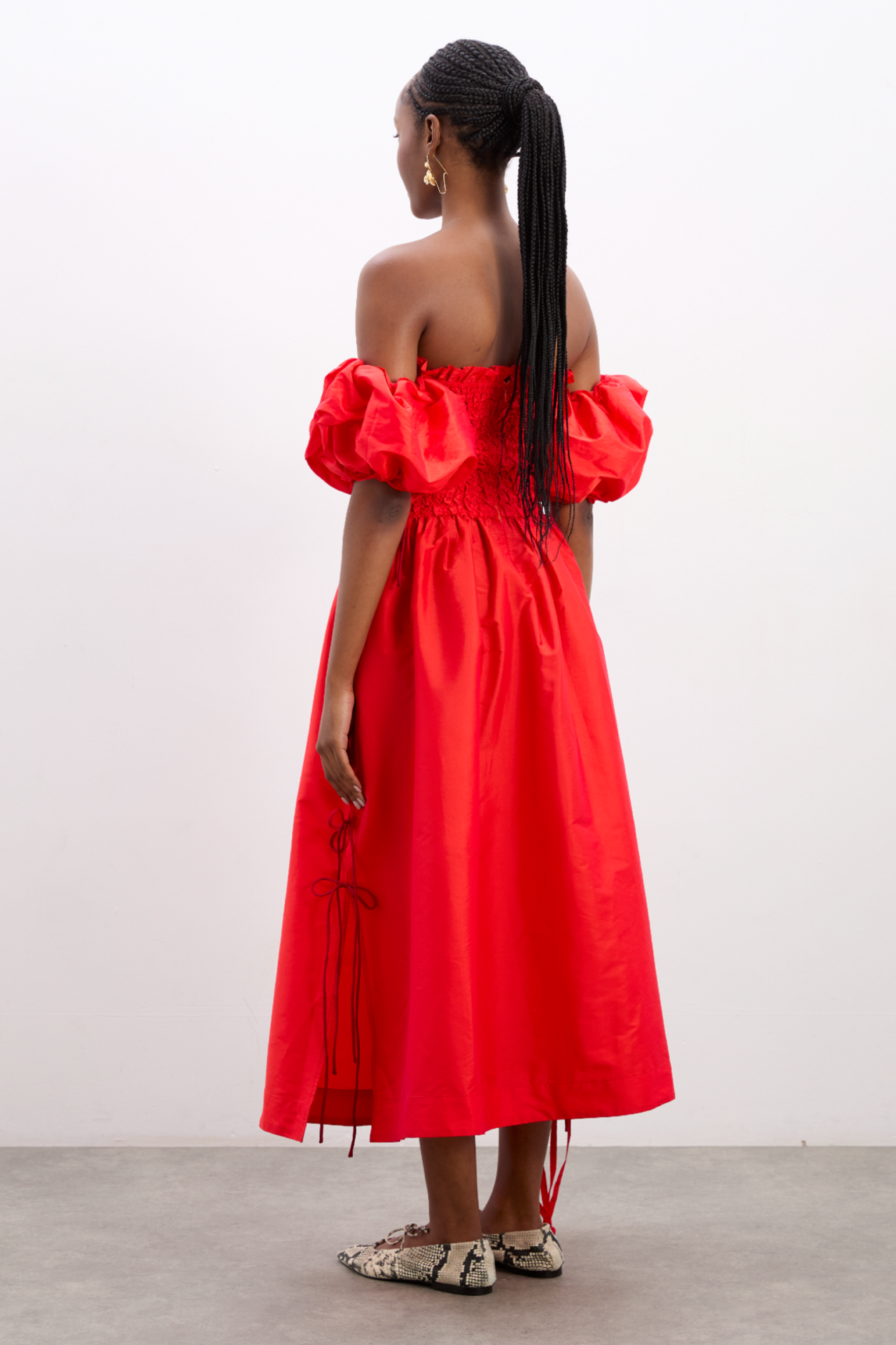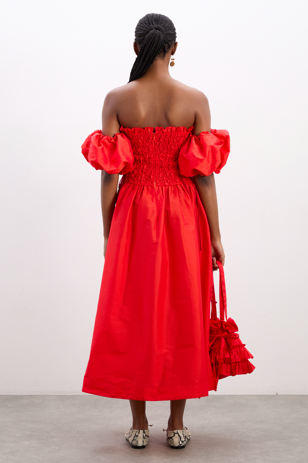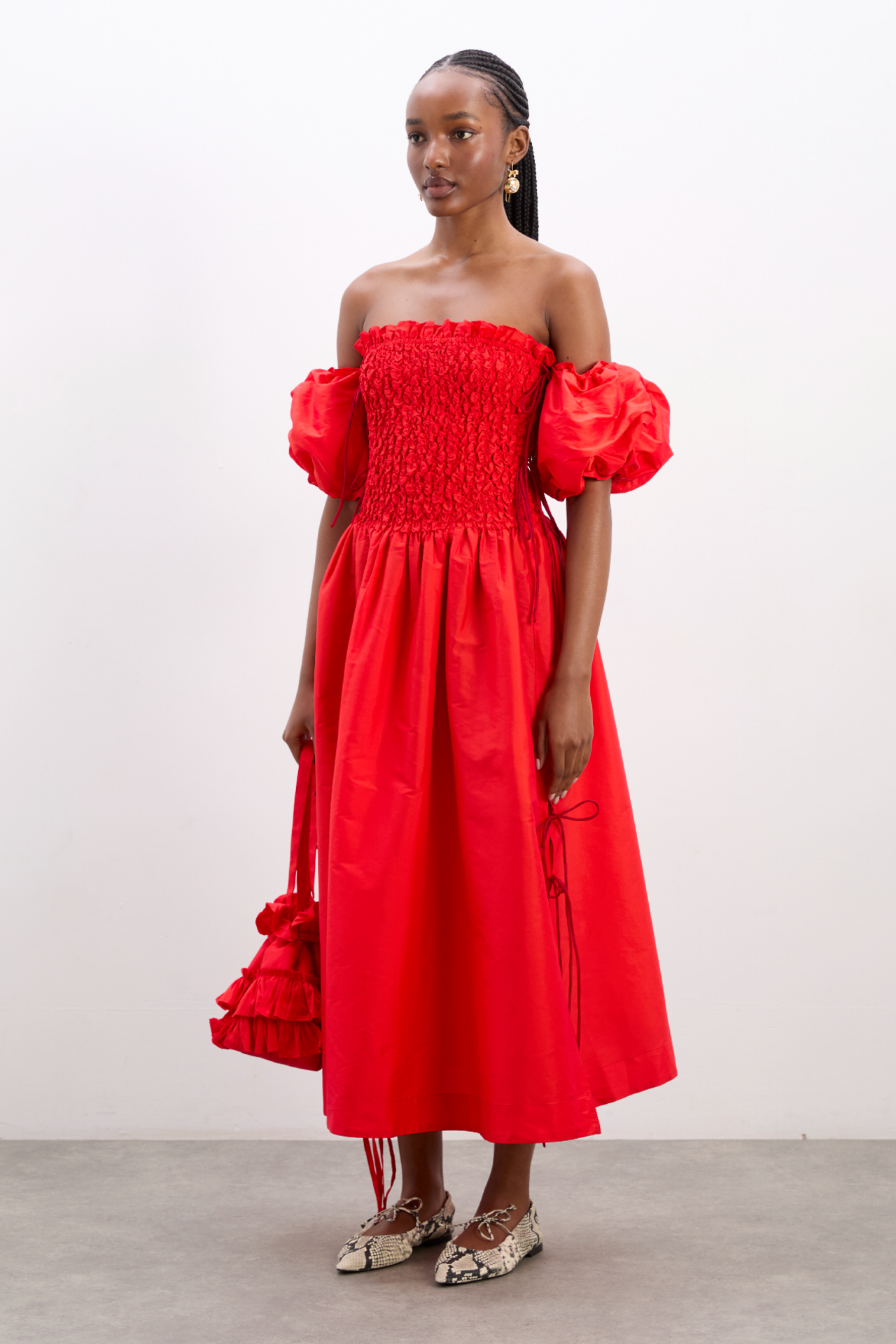 With a flattering shirred bodice and splits at the hem with tie detailing, the Sita Midi Dress is bold yet refined. Featuring removable puff sleeves and straps for versatility. Pairs perfectly with our matching Sita Frilly Pouch Bag.