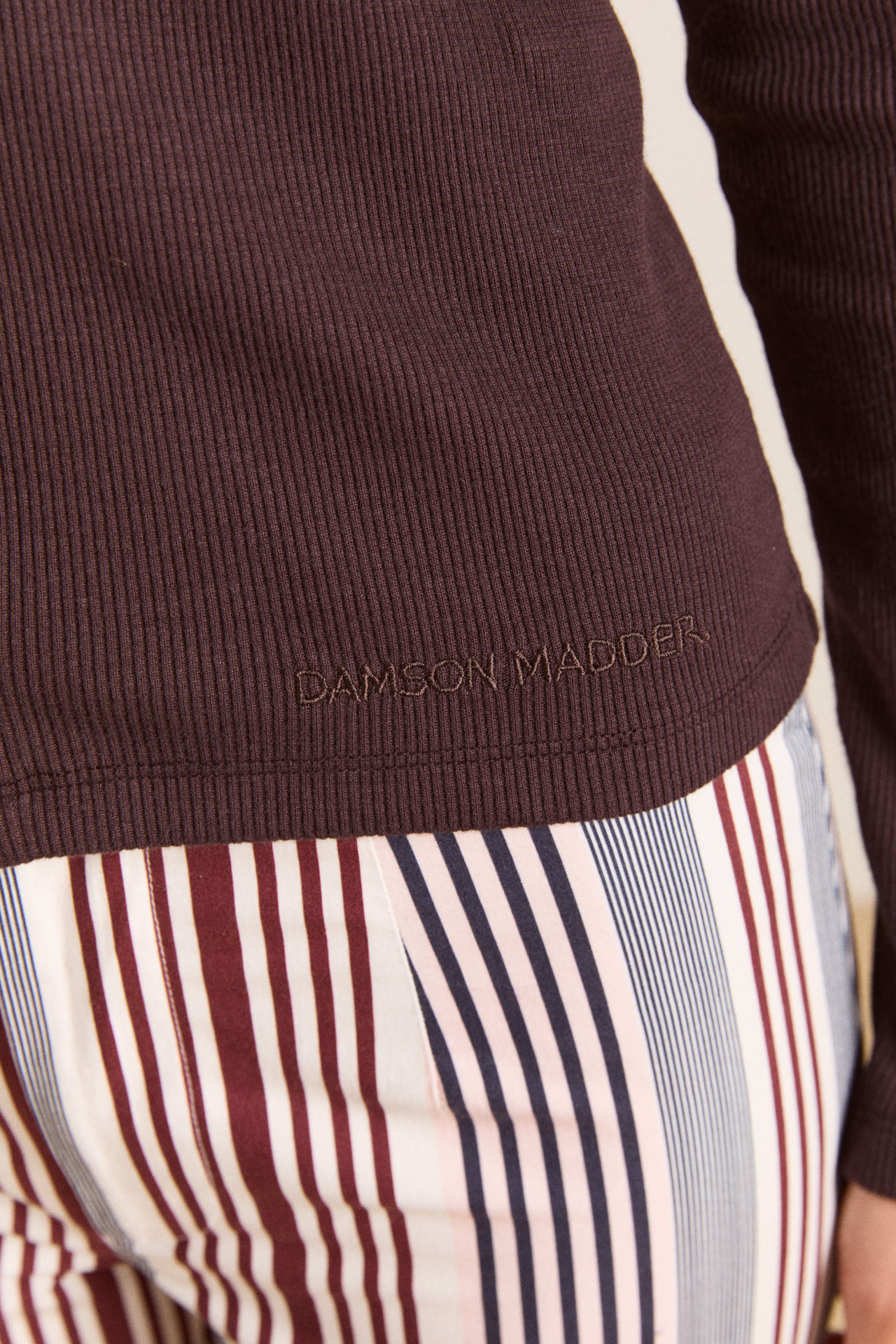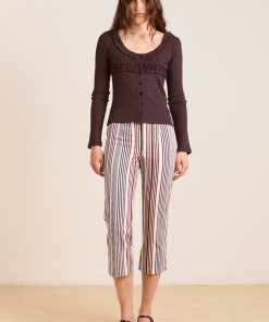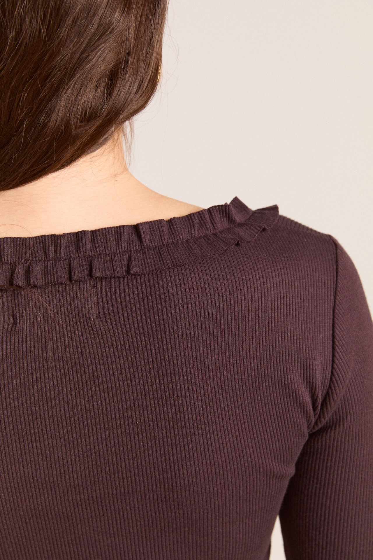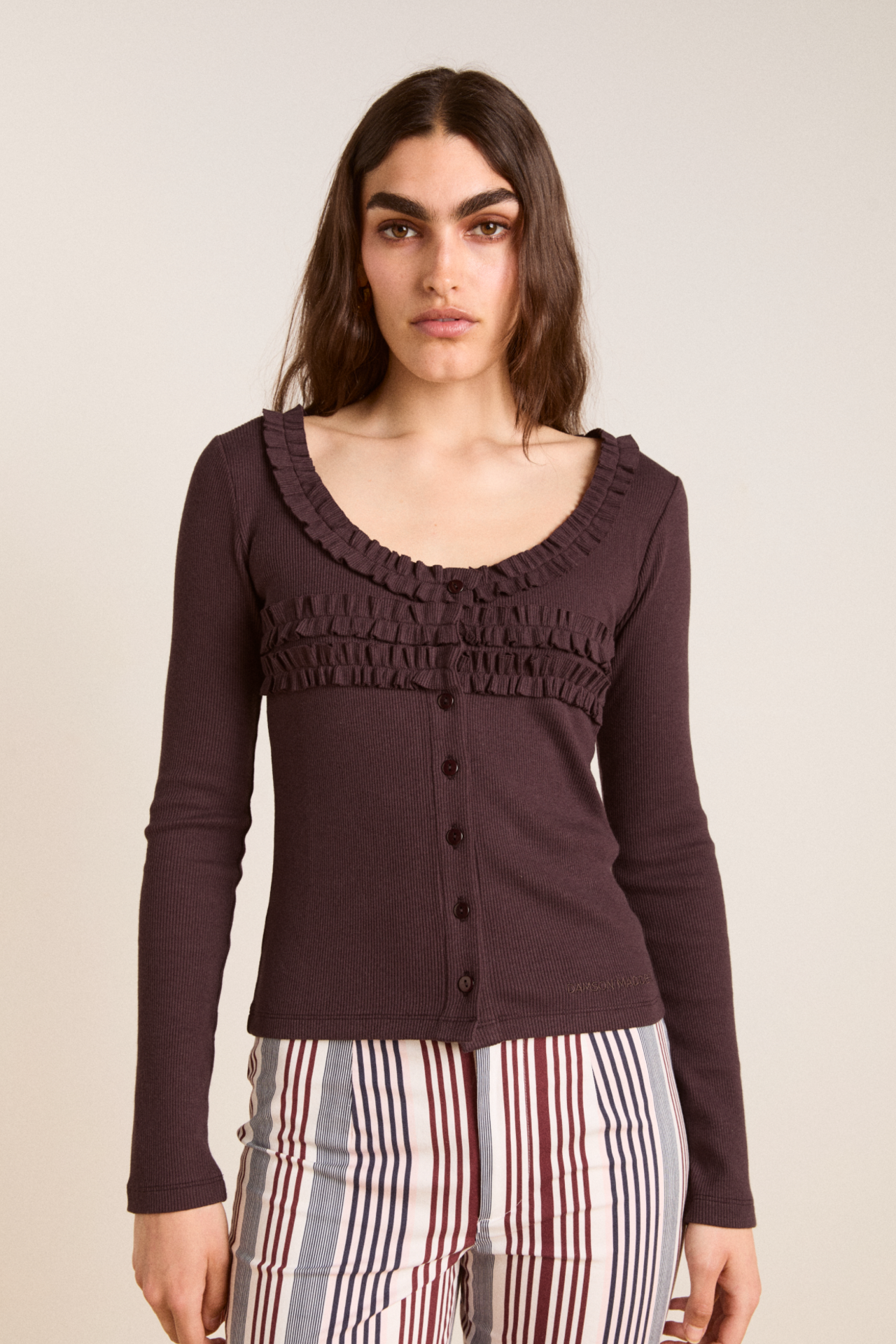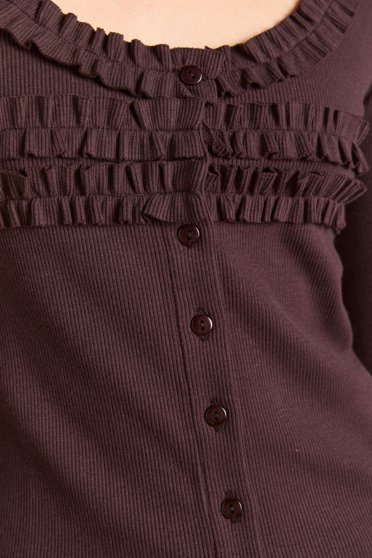 The Varsha Frilly Cardi in brown is the epitome of easy wearing. Crafted from soft jersey rib fabric with a rounded neckline, and finished with sweet vintage-inspired ruffle detailing. The Varsha will be on high rotation.